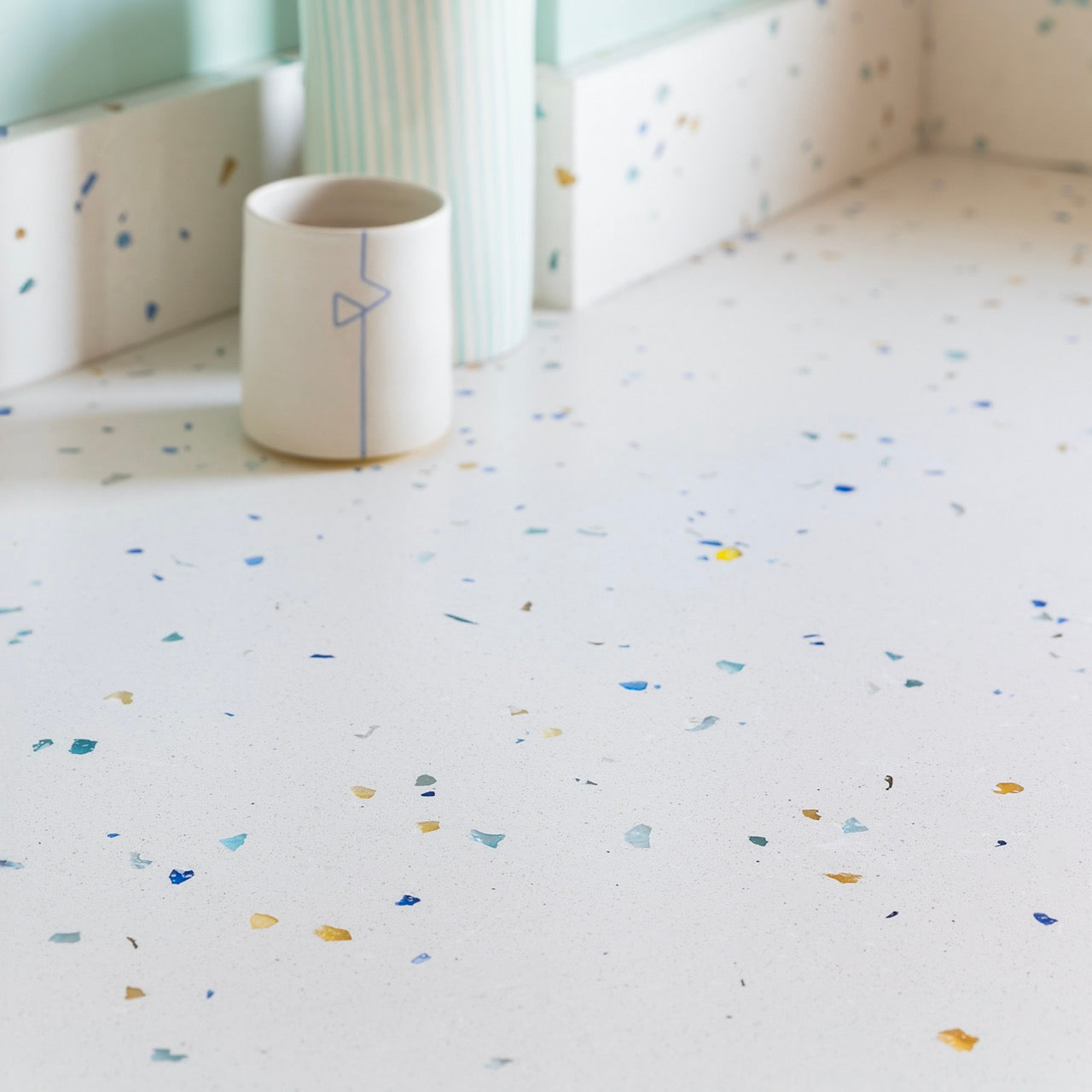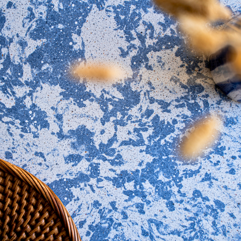 Avec des inclusions de verre coloré, de nacre et de pierres semi-précieuses, Osmi se réapproprie l’art ancestral du terrazzo dans un style résolument moderne.