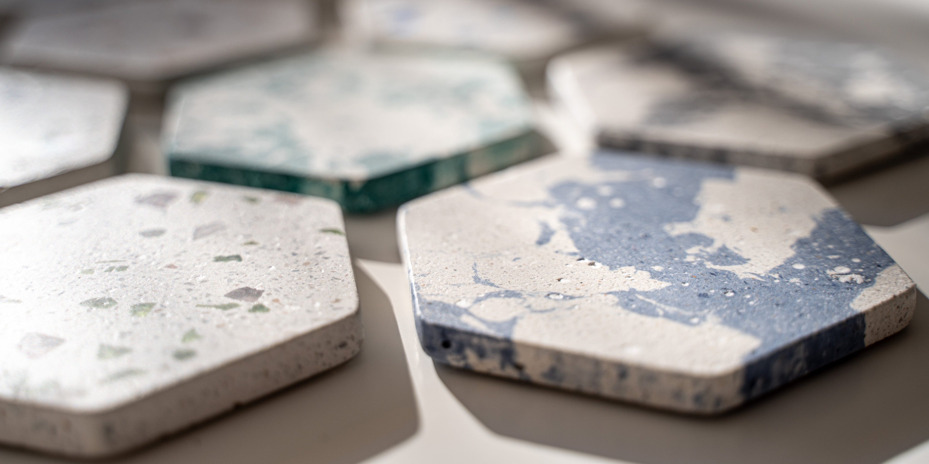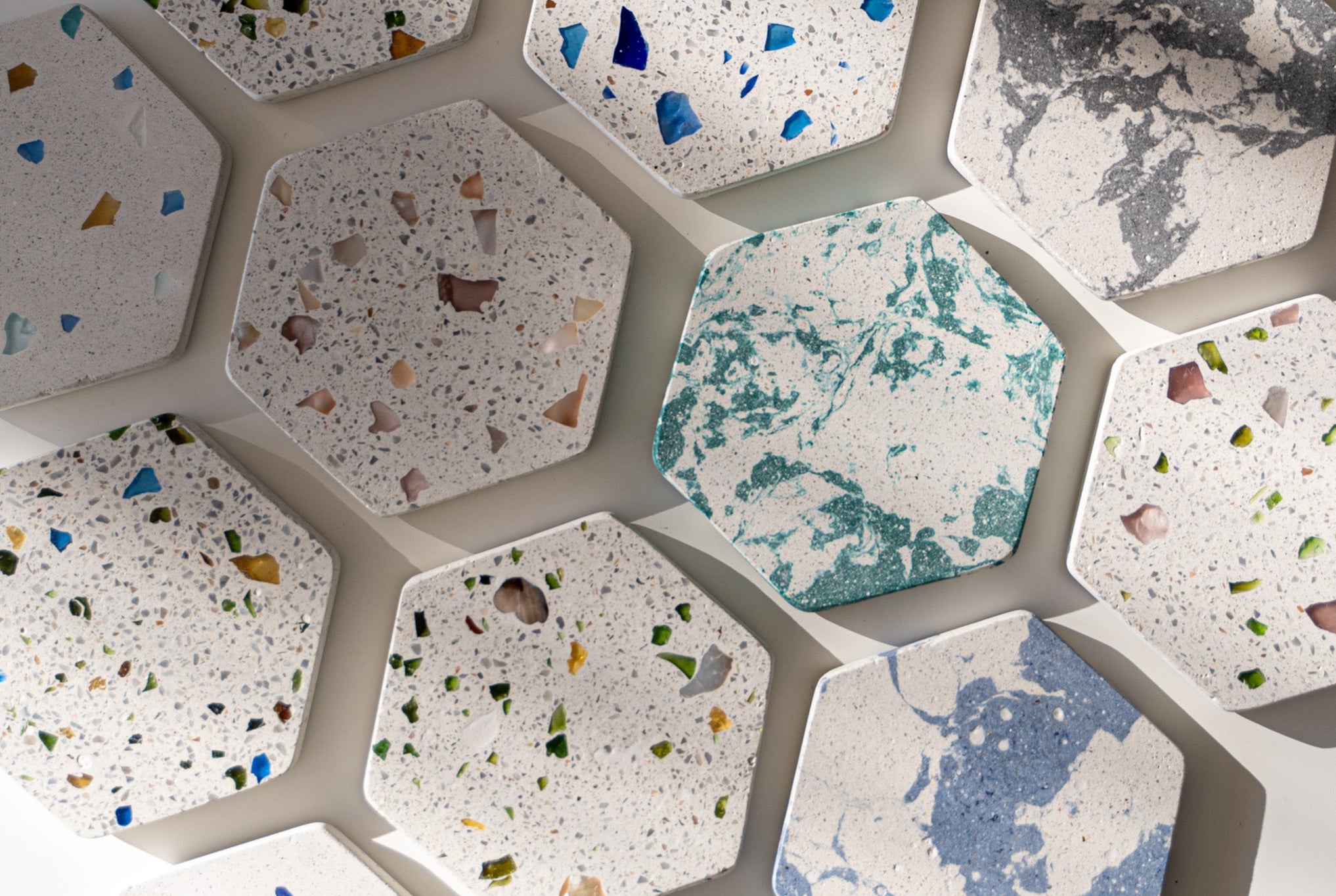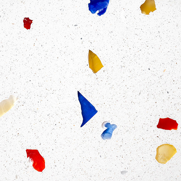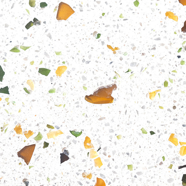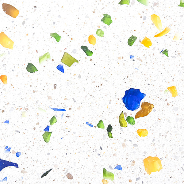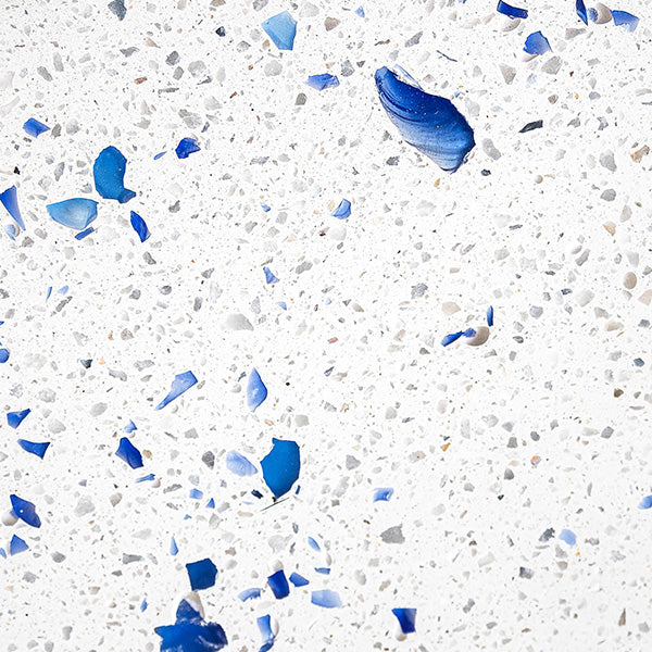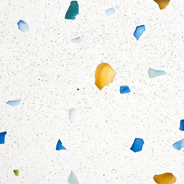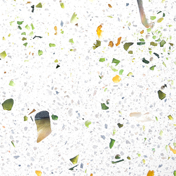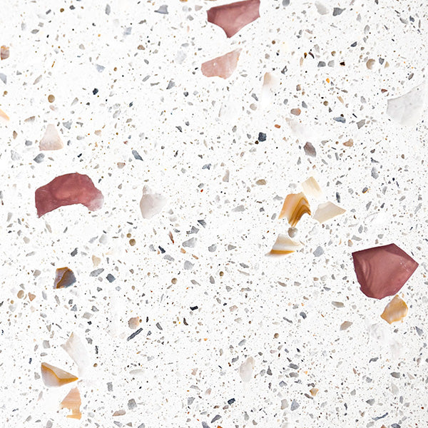 Nos mixs de terrazzo sont élaborés à partir de verres recyclés, marbre, coquillages nacrés, pierres semi-précieuses…