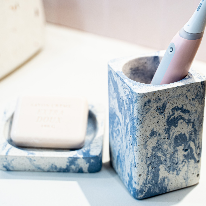Alliant design élégant et fonctionnalité, notre set de salle de bain Izzy en béton marbré est composé d'un pot et d'un porte-savon. Fabriqué à la main en France, il apporte une touche de raffinement à votre intérieur tout en étant conçu pour résister aux défis du quotidien.