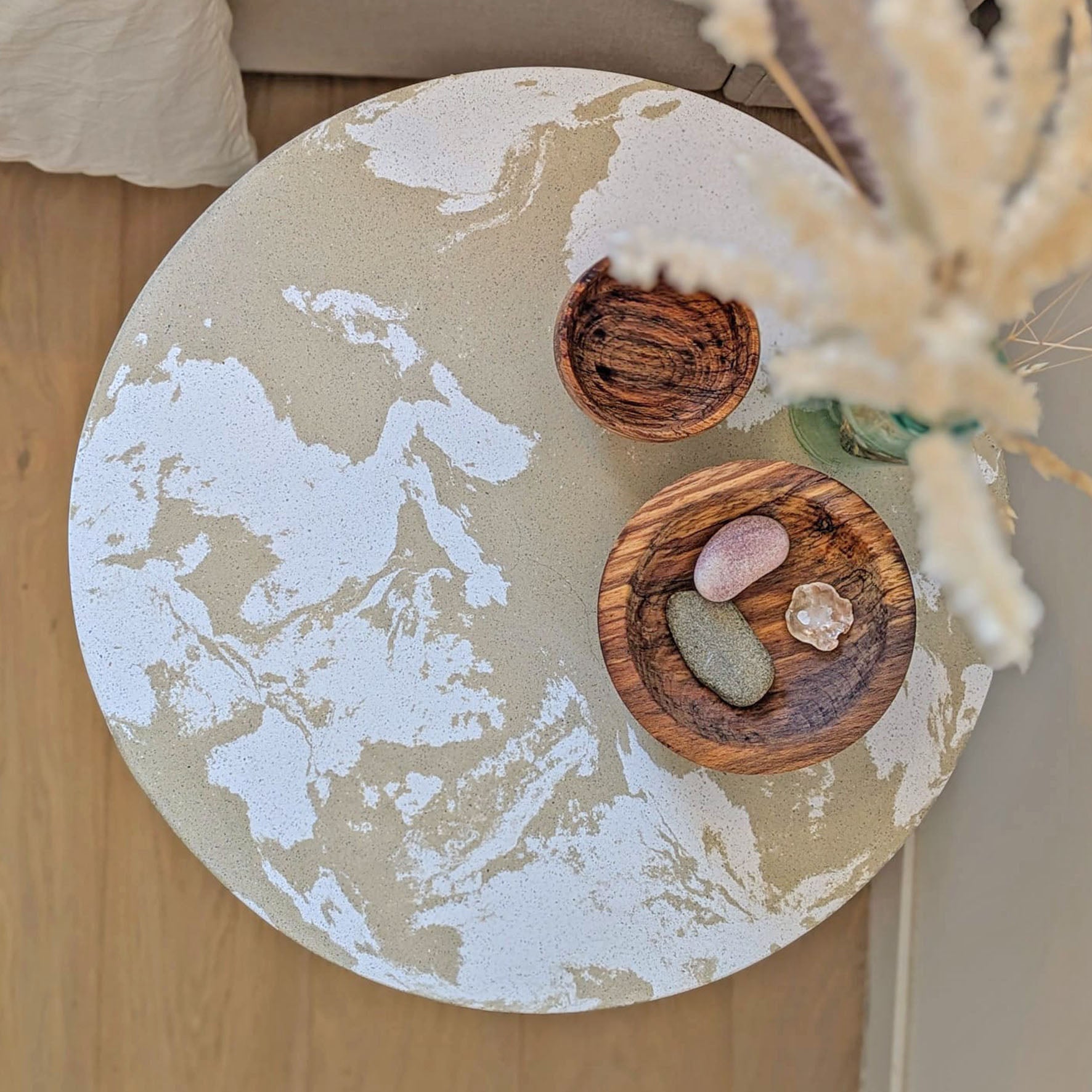 NB: Pour les variantes en terrazzo, seule la face supérieure du plateau est en terrazzo, le reste de la table est en béton blanc assorti.